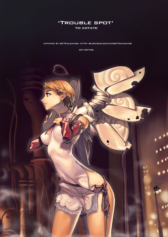 其實這算是我畫圖一年多來,第一次耐下心來臨摹什麽的。之所以臨摹金亨泰的圖,並不是說特別喜歡他的透視感,好吧,這不是爲了自己抓型不准找藉口┭┮﹏┭┮~ 喜歡的還是他的設計感還有質感的表現。於是,這張臨摹圖自己最滿意的應該也就是衣服質感的表現了吧。很喜歡他那在衣服下擺邊緣,那種絲質面料與蕾絲之間層疊的感覺。背後那個螺旋槳也很有愛,感覺這部份自己臨的還湊合吧,大概。再於是,感覺整體還不夠完美,很多地方型不到位,最後,原圖很不厚道的不貼了- -。